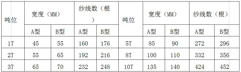 (2)各種噸位的吊帶皮的寬度,紗線數量如下表所示,將緯線從減震溝針上穿入在擺針,轉動手輪,看緯線和鎖邊線是否能順利鉤在鉤針上,然后點動織機,看送緯量大小一般根據織出的帶皮寬、窄來定,寬為送緯量