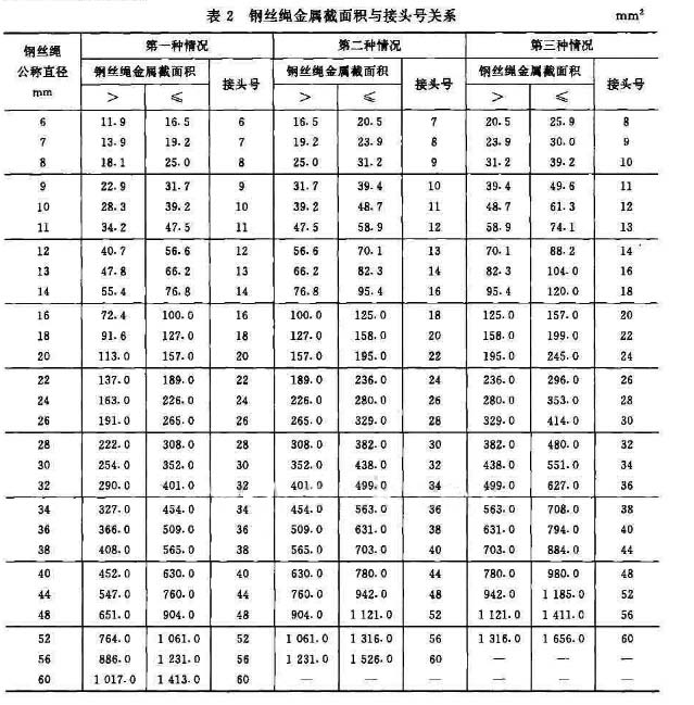 接頭號的選取與鋼絲繩公稱直徑及其技術截面積有關。按表中鋼絲繩公稱直徑 ,再根據鋼絲繩的結束截面積選取接頭號。介于表2鋼絲繩公稱直徑系列之間的鋼絲繩,應按下列原則靠入系列: