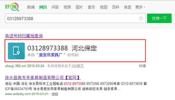 3、通過360瀏覽器查詢該企業網站的座機電話,比如奧發吊索具有限公司的的電話:0312-8973388