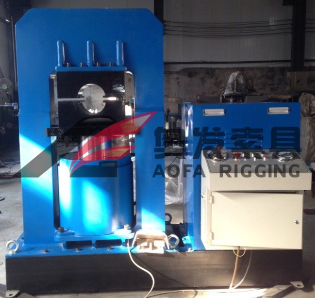 6、將繩和套置于模具中按下扣壓按鈕(指示燈亮),油缸上升,上下模具合攏,壓至位置后,再按下松開按鈕(指示燈亮),油缸下降、上下模分開,取出壓好的鋼絲繩套,鋼絲繩壓套機進行下一輪工作。